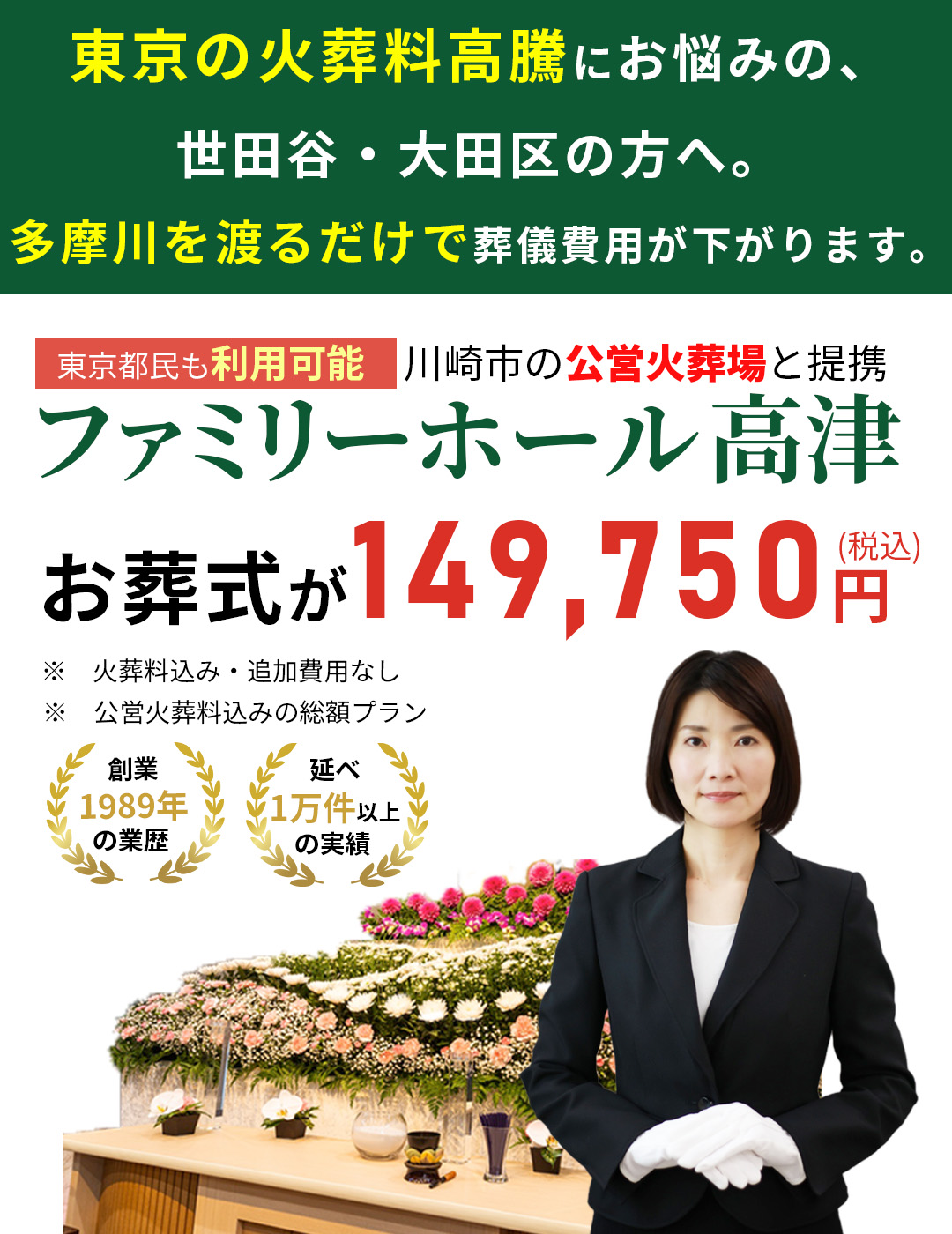 公営火葬場利用+火葬料込みの独自プランで、都内相場より約10万円近く総額費用を抑えられます。